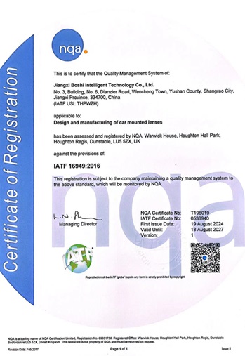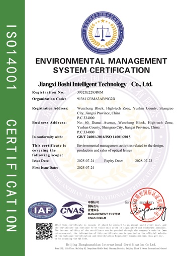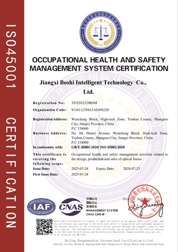 Dit betekent dat Baoshi Intelligence een gestandaardiseerd managementsysteem heeft opgezet dat de gehele keten van onderzoek en ontwikkeling op het gebied van optische lenzen, productie, verkoop en after-salesdiensten bestrijkt, waarmee een solide basis wordt gelegd voor de voortdurende levering van producten en diensten van hoge kwaliteit.