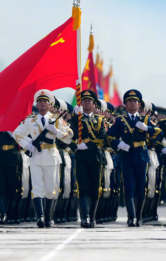 Om 10.00 uur, toen de militaire parade begon, werd het plechtige volkslied gespeeld en stonden alle deelnemers spontaan op om respect te betuigen. De nette treden van de voetformaties, de geavanceerde uitrusting van de bewapeningskolommen en de majestueuze luchtechelons schokten iedereen diep, wat de verbetering van de nationale defensiekracht van China aantoonde. Het tonen van 80 erevlaggen van anti-Japanse oorlogsheldeneenheden deed mensen ook beseffen hoe zwaar de overwinning was behaald.